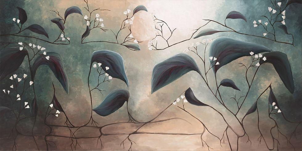 ציור של שלוש בלרינות עשויות עלים בגווני ירוקים בעבודת יד, בצבעי אקריליק על קנבס.